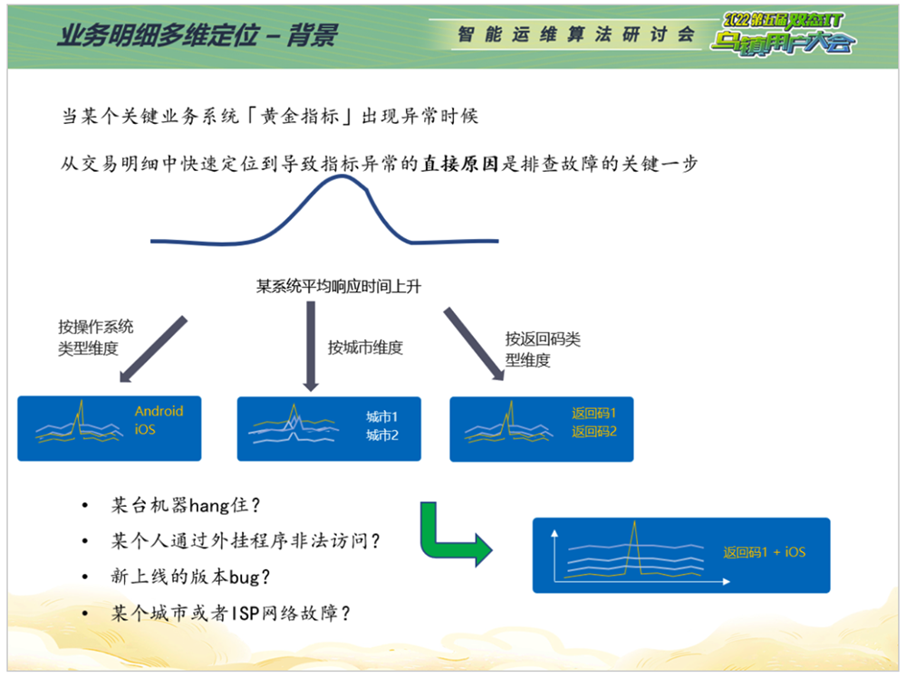 对业务指标异常检测的结果做进一步挖掘,需要用到业务明细多维定位。当网交响应时间在某一个平均时间内增加,是操作系统出现问题,还是某个版本的网交在某个城市出现了问题?是不是通过某个返回码的用户会出现同样情况?这时会涉及到较多维度的分析,传统解决方式是首先对功能号、客户账号、IP等交易明细进行解析,再按照经验对不同维度进行聚合,计算出每一个取值的平均响应时间和交易量。但这种方式无法一次性得到结果,需要对不同组合不同维度进行多次聚合,导致运维管理员无法快速响应告警并定位到异常维度。这时,业务明细多维定位的价值和意义就凸显出来了。