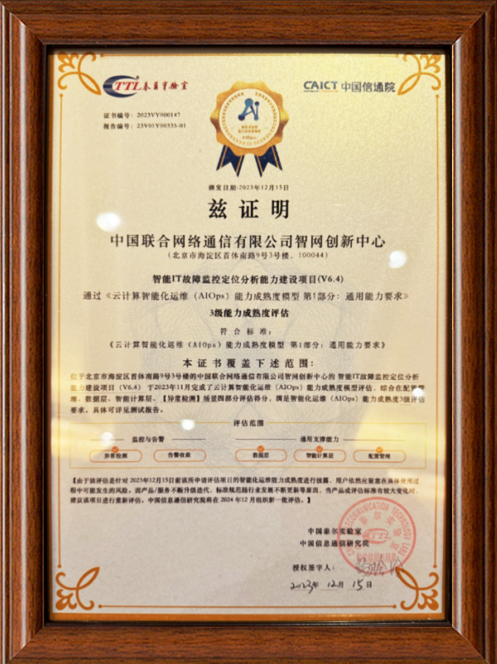 必示科技助力中国联通智网创新中心通过智能化运维(AIOps)通用能力成熟度3级评估