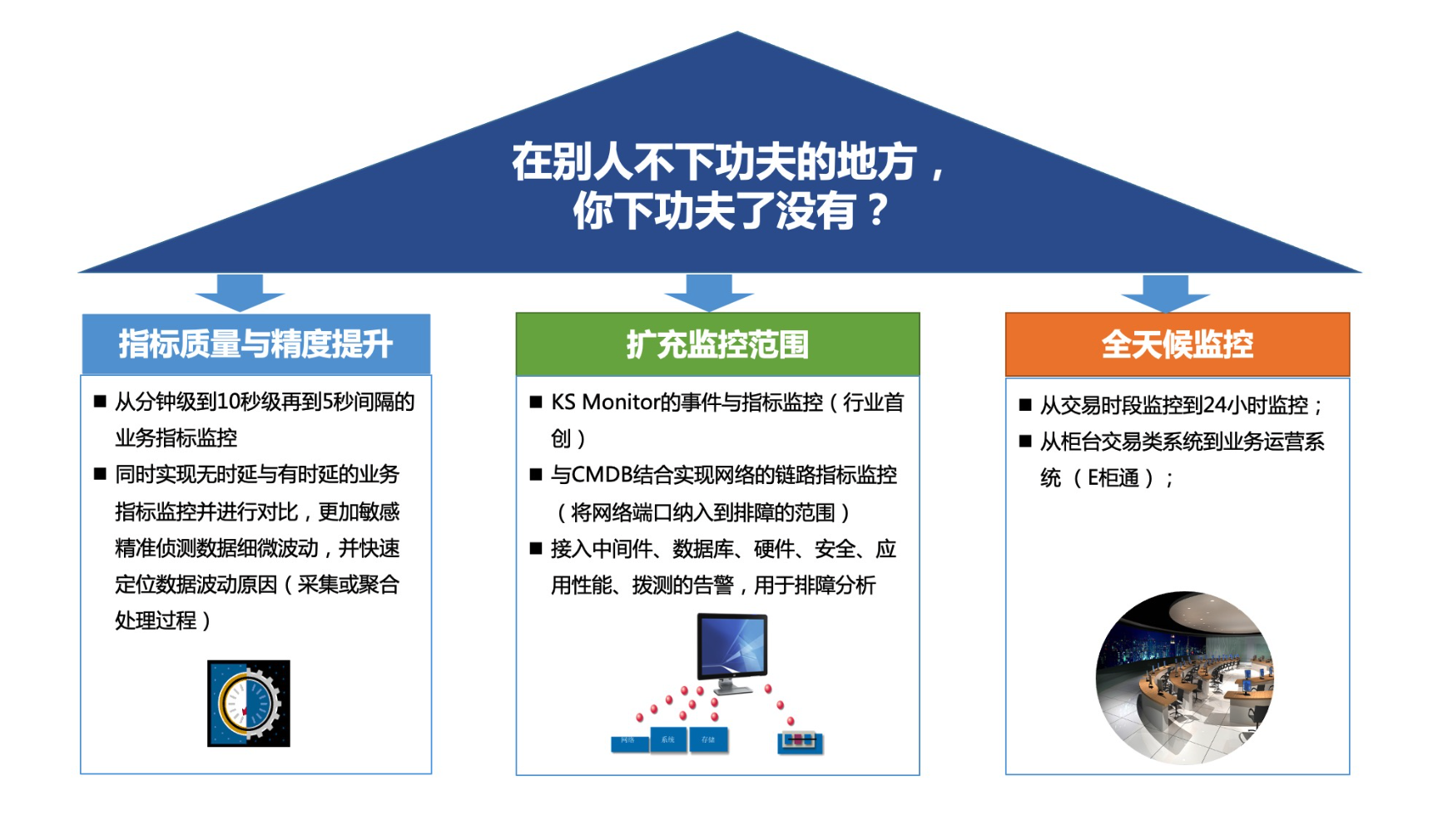 在具体建设中,值得学习的是他们会沉下心,在细节之处下功夫:通过对从数据采集到检测传输持续改造,使业务监控间隔从分钟级、到10秒、再到5秒。这会使系统更敏感地观测到异常交易的细微波动,同时也能够更迅速和高效地定位波动的原因,以此来实现异常检测质量和精度的双提升。再比如该证券国内首创地对KS Monitor的事件与指标监控,并与CMDB结合实现链路指标监控,另外接入了中间件、数据库、硬件、安全、应用性能、拨测等指标,以此来持续扩充监控范围,这也为后续排障分析的效果建立了基础。另外,该券商将交易时间监控扩展到24小时监控,实现全天候监控,监控范围从柜台交易扩大到业务运行系统的E柜通监控。总之,他们通过对细微因素的逐渐打磨和提升,实现了效果提升。