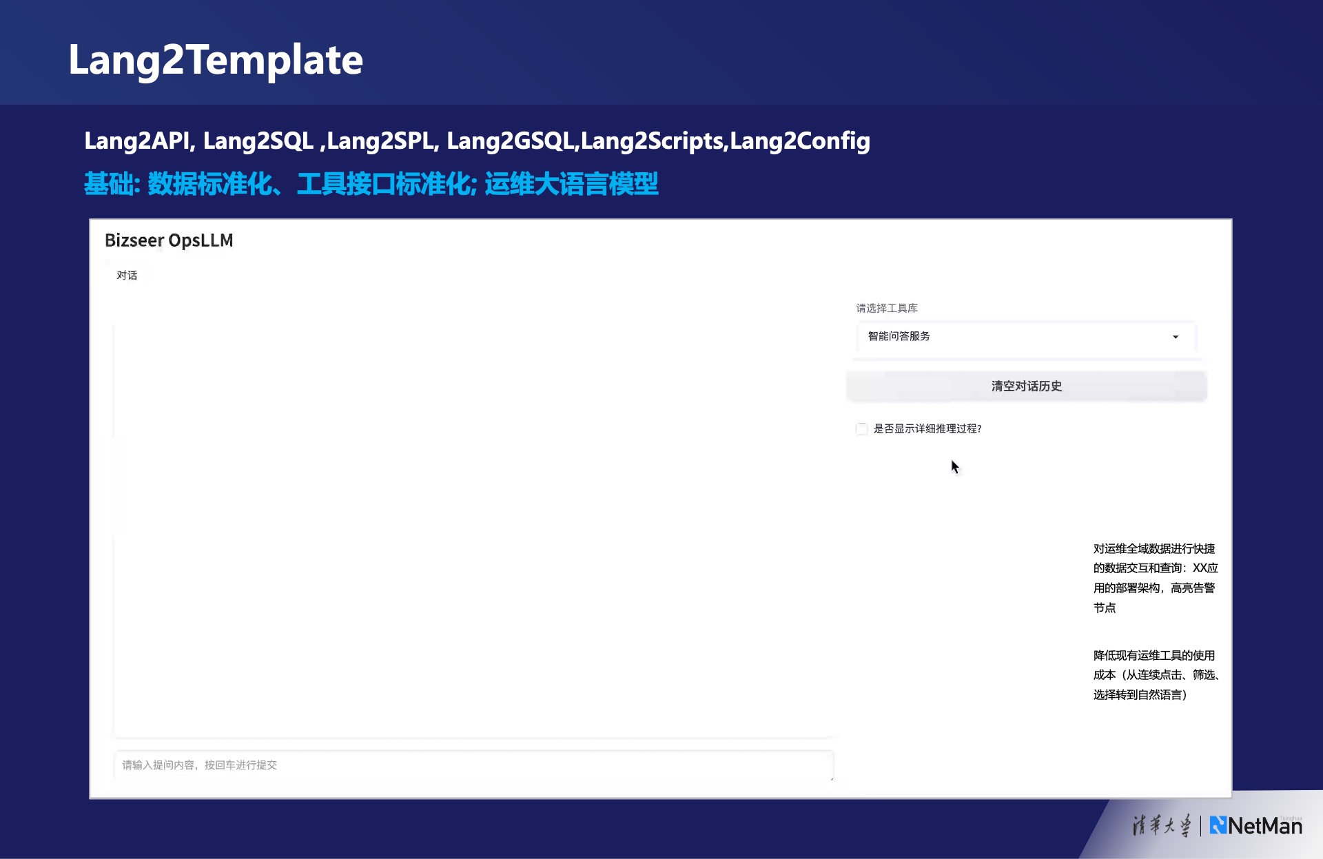 为已有的智能运维工具和自动化工具提供交互增强。交互增强指的是从文字角度的意图识别和结果总结能力。举例来说,某款工具导入了所有的监控数据后可以进行各种风险告警、故障告警,从监控数据到自动建单,并给出根因分析结果。如果在最外层加入基于大语言模型的输入输出的增强,这个工具的便捷性和受欢迎程度将大大提升,前提是需要进行一些数据处理和接口标准化的工作。这是对单个运维工具进行提升的方法。