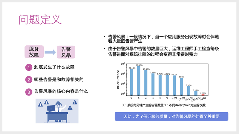 为了保证服务质量,处置告警风暴至关重要。论文中,我们主要回答了“告警风暴中到底发生了什么故障”“哪些告警与故障相关”“告警风暴的核心内容是什么”等问题。