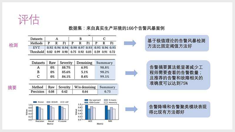 我们在真实环境中166个告警风暴案例上做了测试,可以发现:从检测方面来看,极值理论的告警风暴检测比固定阈值方法要好;从摘要的方向来看,告警摘要算法能显著减少工程师需要查看的告警数量,并且推荐的告警与故障相关的准确率达到75%,极大缩小了查看的范围,有助于经验聚焦得到有意义的告警。