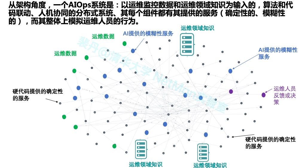 前述原则2讲的是从价值角度如何做AIOps规划,而原则3则聚焦AIOps在架构上的路线。总体而言,从架构角度(如下图所示),一个AIOps系统是:以运维监控数据和运维领域知识为输入的、算法和代码联动的、人机协同的分布式系统、其每个组件都有其提供的服务(确定性的或模糊性的),而其整体上模拟运维人员的行为。下面我们分三个方面逐一阐述。