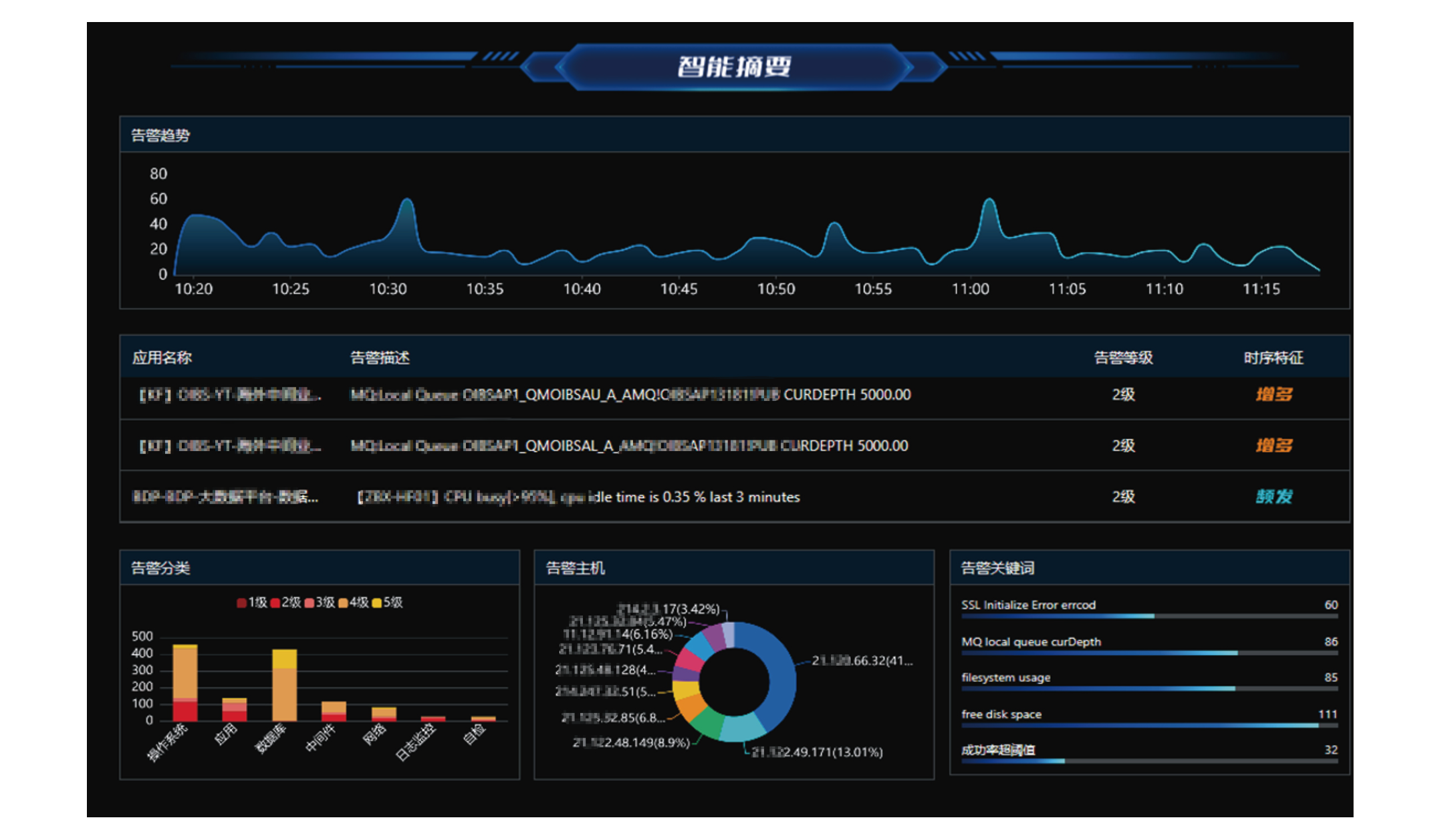 通过故事化的场景和直觉化的设计,让应急排障不再困难,通过构建智能摘要大屏、智能推荐大屏和智能告警大屏,让一线人员可以直观且全面的感受和理解数据信息。 告警推荐大屏:通过智能算法提供异常程度最高的Top5业务系统,同时展示每个业务系统中最需要关注的告警描述、告警 等级及时序特征三类关键信息,辅助管理员进行快速故障排查。 智能告警大屏:以时序图的方式清晰展现告警脉络,同时从应用视角展示故障传播情况,辅助管理员快速进行告警追根溯源。